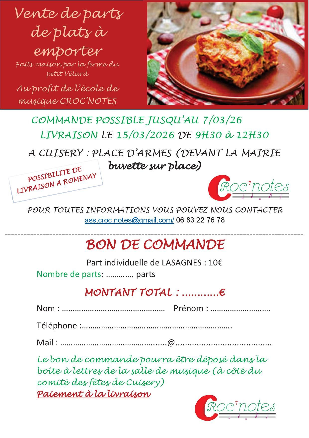 vente de lasagnes – au profit de l’école de musique Croc Notes – dimanche 15 mars de 9h30 à 12h30 – place d’Armes – 10€ la part – infos et réservations : ass.croc.notes@gmail.com – 06 83 22 76 78